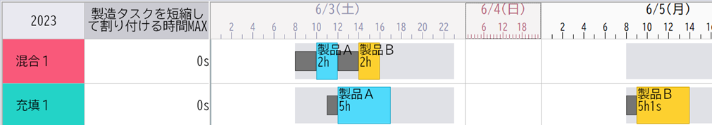 これをBefore・Afterで示します。上の画像では「製品B」の充填が、月曜日に割り付けられています。しかし下の画像では、「製品B」の充填をすき間に割り付け、土曜日に作業が終わるようになりました。新機能を使い、短縮時間の最大値を5分とした結果です。時間が短縮された場合は、製造タスクの右上に緑色のアイコンを表示します。