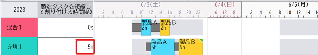 新機能は次のようなものです。「製造タスクを短縮して割り付ける時間MAX」を指定すると、製造タスクを短くして、すき間に押し込むことができるのです。