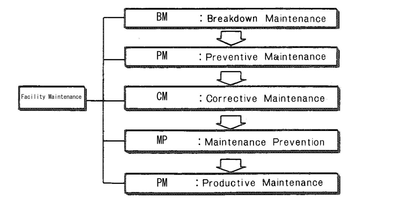 Facility Maintenance has five methods as depicted in the figure, and the form has been changing with the times。Before preventive maintenance was introduced from America in 1951, the method of breakdown maintenance was commonly used, but in 1950s it developed from breakdown maintenance to corrective maintenance, and maintenance prevention, and in 1960s it reached the scheme of unifying them, productive maintenance.