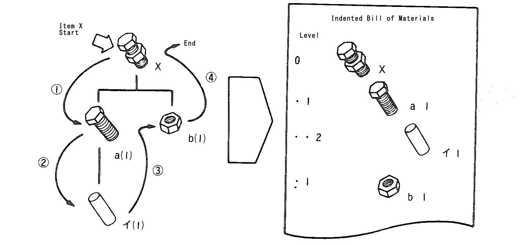 It is a bill of materials to show the lower-level items of the specified item by level according to the structure, and is used for the engineering of the similar products, the consideration of the production improvement or the product cost, and the planning of the product manufacturing, and etc. In the example shown in the figure, when Item X is specified, its Child Item a is first displayed, next the Child Item "イ" of Item a is displayed. In this way, in the Indented Bill of Materials, each item is displayed by level according to the structure of specified item. The method of Indented Explosion is used to create Indented Bill of Materials, where the bill of materials showing a structure is searched level by level from top (product) to bottom (materials). The number of level is used to show a bill of materials.