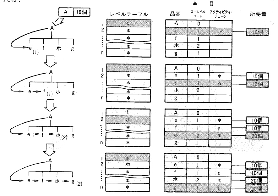 所要量展開の1機能で、作成された予定オーダーを基に部品表を参照して、子品目の展開を行い、各品目の所要量を算出する。この展開は、レベル・バイ・レベルの展開を実現するために、所要量展開のもう1つの機能である抽出と対で用いられ、ローレベルコード、レベルテーブル、アクティビティ・チェーンを使用する。たとえば、品目Aで数量10個というオーダーの段階所要量展開は、下図のように行われる。