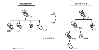 是意识到部件的加工、产品的组装顺序,维系母品项和子品项的关联、表现产品结构的物料清单。例如图中的概览物料清单中表示的产品Z的构造物料清单,以着母品项和子品项、还有子品项和孙品项这样的形式就像表示产品结构一样建立关联。这样的构造物料清单在掌握设计变更的影响、分品项成本计算,以及计算采购品、内制品的需求量等时使用。
